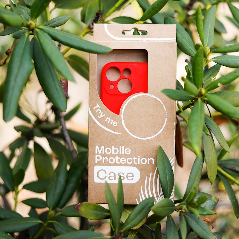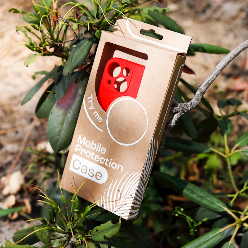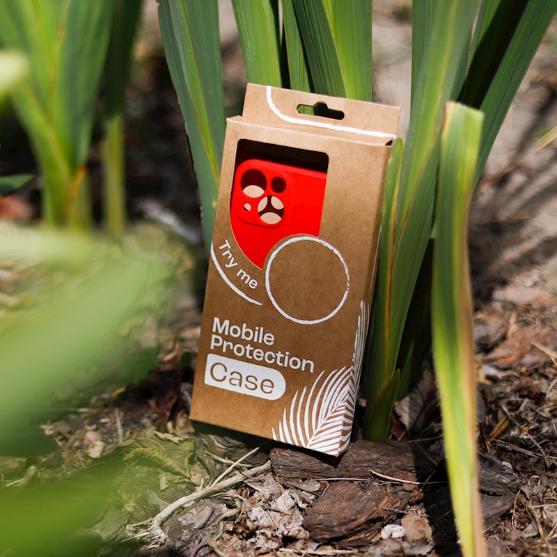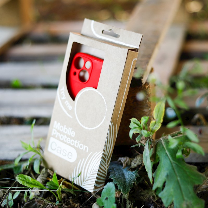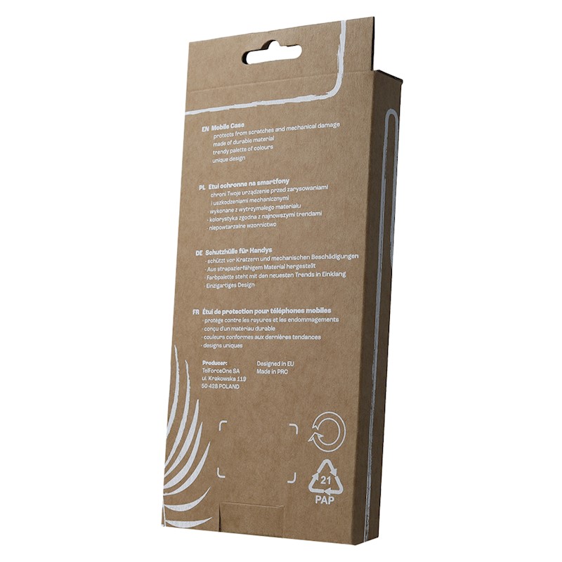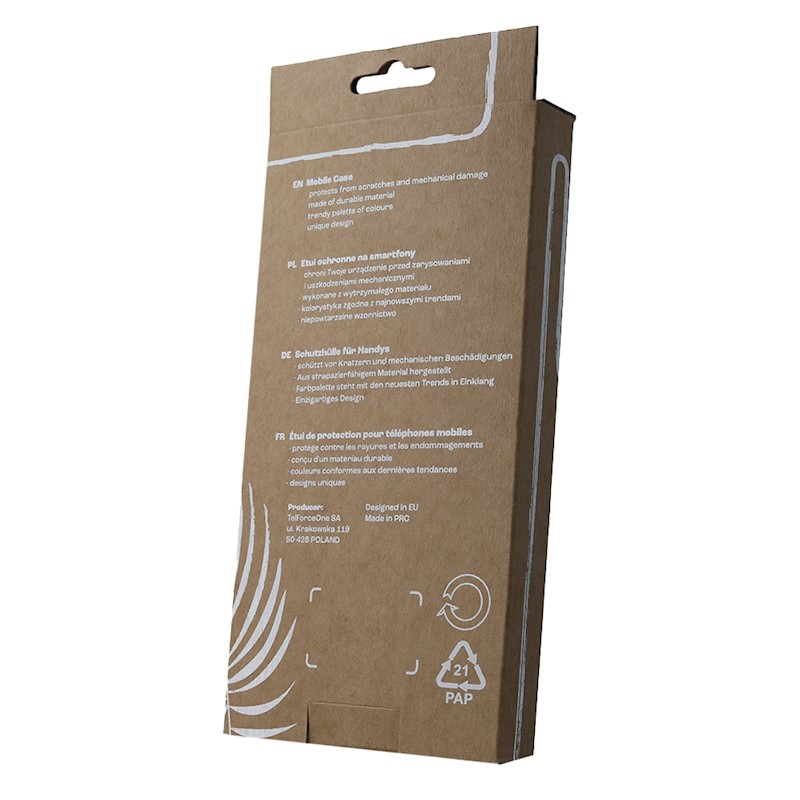 Cardboard box for phone overlays and covers. The product is universal and has a hole for easy hanging on hooks. The packaging has a minimalist design. The cardboard is recyclable. We limit the number of prints to protect our natural environment.