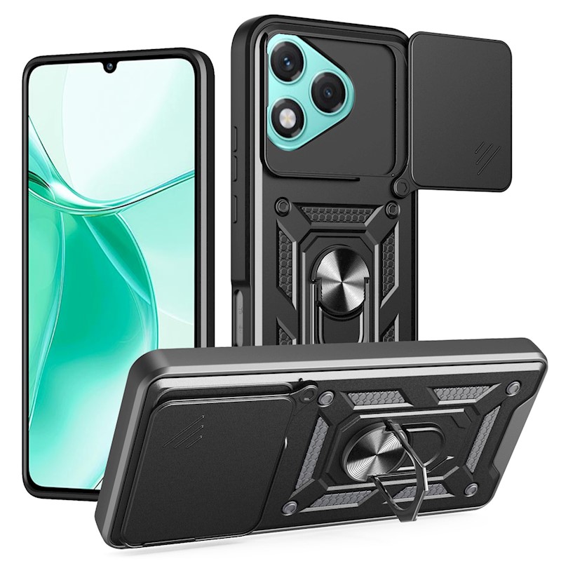 Defender Slide is a reinforced case for smartphones that provides good device protection. The product consists of several layers that stiffen and strengthen its structure. The case is made of PC, TPU, and has a built-in aluminum finger holder. The entire series features a movable camera cover that protects the lenses and ensures privacy. Additionally, the higher edges protect the screen from cracking or scratching. The cases have necessary cutouts for ports and embossed areas for buttons. The frame has openings that allow for attaching a strap or lanyard. The Defender Slide case is compatible with magnetic mounts.