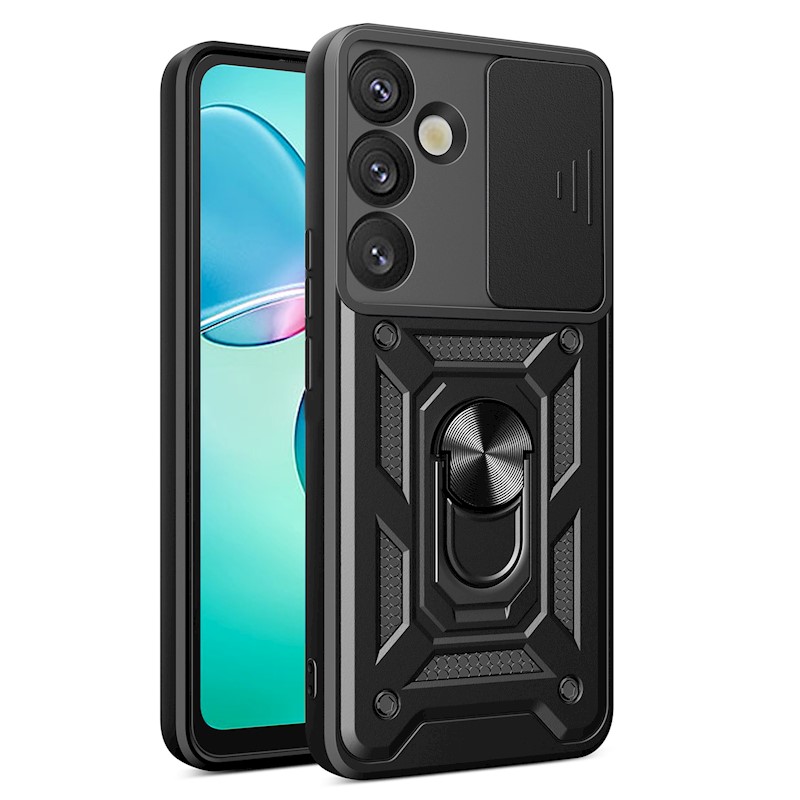 Defender Slide is a reinforced case for smartphones that provides good protection for the device. The product consists of several layers that stiffen and strengthen its construction. The case is made from PC, TPU, and features a built-in aluminum finger holder. The entire series has a movable camera cover that protects the lenses and ensures privacy. Additionally, raised edges protect the screen from cracking or scratching. The cases have necessary cutouts for ports and embossed areas for buttons. The frame has holes that allow for the attachment of a strap or lanyard. The Defender Slide case is compatible with magnetic mounts.