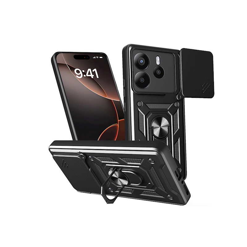 Defender Slide is a reinforced case for smartphones that provides good protection for the device. The product consists of several layers that stiffen and strengthen its construction. The case is made from PC, TPU, and features a built-in aluminum finger holder. The entire series has a movable camera cover that protects the lenses and ensures privacy. Additionally, raised edges protect the screen from cracking or scratching. The cases have necessary cutouts for ports and embossed areas for buttons. The frame has holes that allow for the attachment of a strap or lanyard. The Defender Slide case is compatible with magnetic mounts.