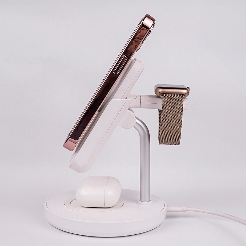 Magnetic Wireless Charging Station with Power Bank MACS-100 The Forever 5-in-1 magnetic wireless charging station is a versatile charger that allows simultaneous charging of 3 devices. Its compatibility with the MagSafe system and with phones that support wireless charging ensures hassle-free charging of various device models. It also features a built-in USB-A port. Additionally, it comes with a built-in power bank with a capacity of 5000 mAh, which can be easily detached and taken on the go, guaranteeing independence and mobility in any situation. This is an ideal solution during travel or in places without access to electrical outlets. The power bank has a charging indicator built into the side and vents designed to dissipate heat generated during wireless charging. It also has a USB-C port that supports 20W fast charging. The power bank can also charge AirPods with MagSafe functionality. Furthermore, it is equipped with a practical stand that serves as a support while charging the phone, which further enhances the functionality of this device. The set also includes a charger compatible with the Apple Watch, connected via a USB-C port, which can be detached and taken on trips. This is a practical solution, as it can be plugged into, for example, the power bank to charge the watch anywhere. The station features fast wireless charging. The magnetic phone mount and supporting stand ensure the optimal position of the device during charging, which not only facilitates the process but also enhances comfort during use.